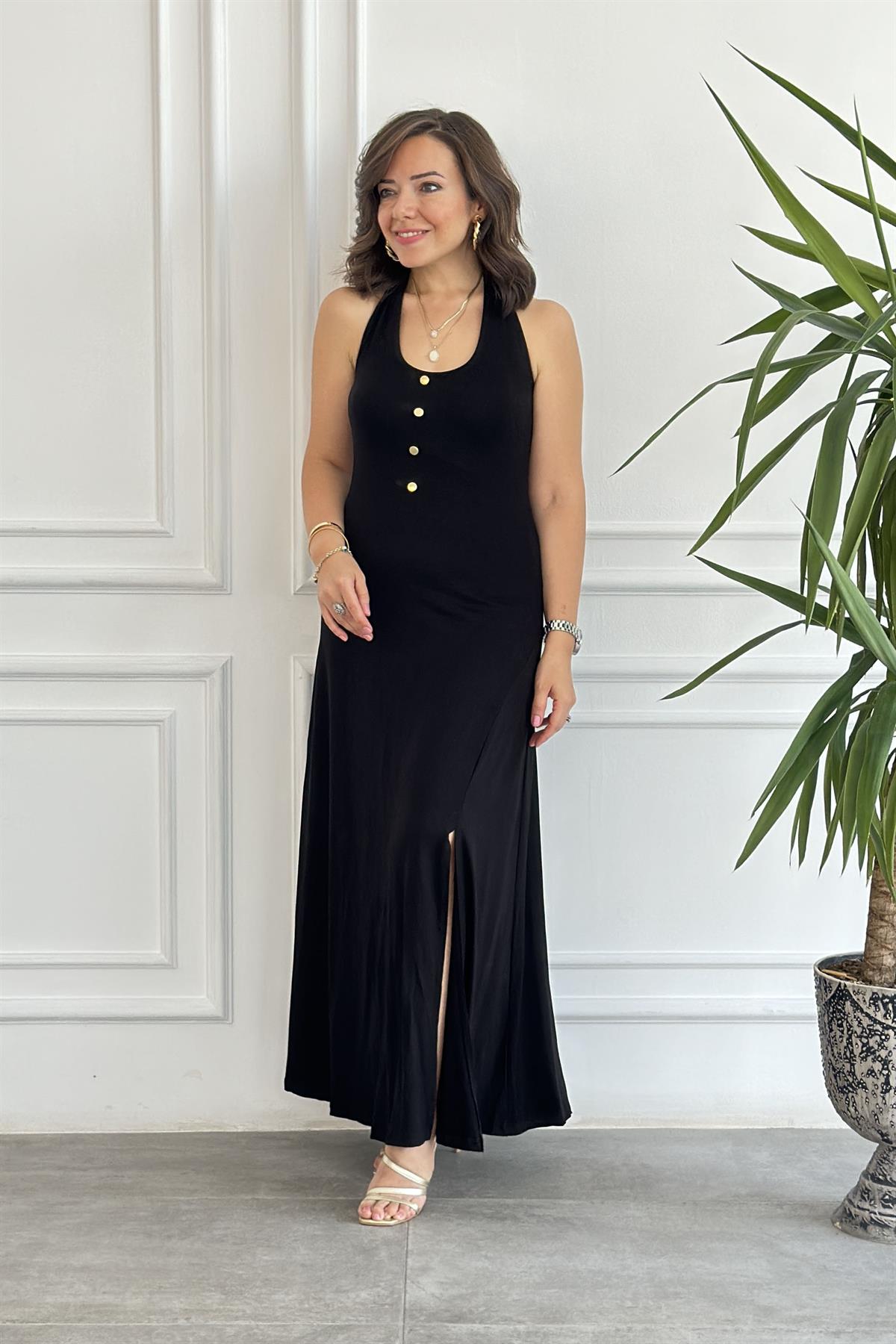 Yandan Yırtmaçlı Düğme Detaylı Kolsuz Elbise