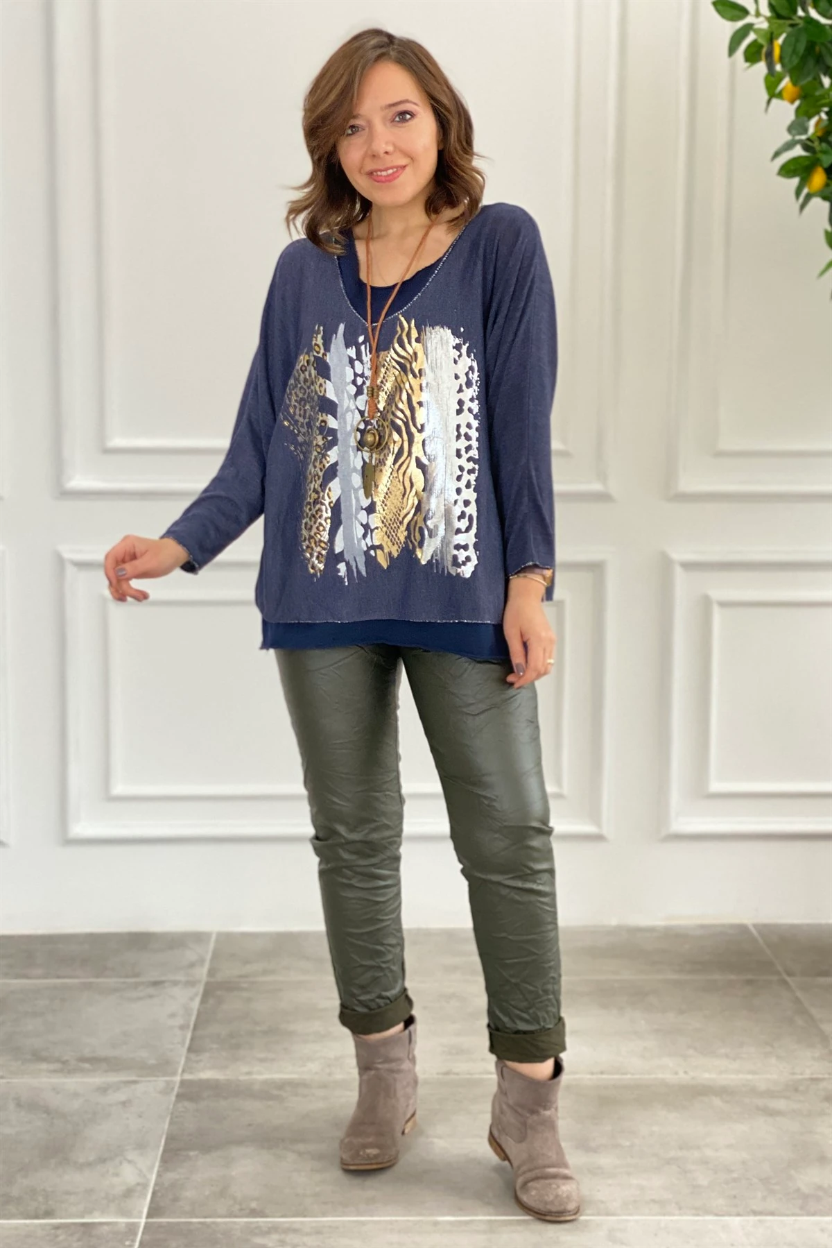 Kendinden Kolyeli İç Atletli Baskılı Bluz